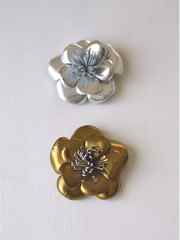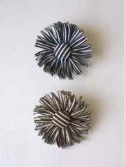 | 概要 | モヘア糸で編むコサージュです。 夏にやっていたアンダリヤのコサージュと同じ編みかたで、 登場するのは、くさり編み、長編み、中長編み、こま編み、引き抜き編み。それだけ。 糸は、上の2色の中からお選びいただきますが、 量に限りがあるので、なくなり次第終了します。そしたらほかの糸に替えるかも。 直径約6cm。色は、上からグリーン/オレンジ | ヒッコリーストライプ(デニムの一種)で作るこのコサージュは、 10年以上前から作っているお気に入り。 ボンドを塗り、切り込みを入れて、ぐし縫いして縮めて・・・と、縫うところはほんの少しだけ。 花芯には、共布で作ったくるみボタンをつけます。カジュアルに使えて、難易度もいちばん低いかな? 直径約7.5cm。色は、上からネイビー/ブラウン。 | メタリック・レザーで作るコサージュ。 花弁は、型紙をあてて革を裁ち、縁がくるっと丸くなるように形づくります(コテは使いません)。 花芯は、細長く裁った革に細かく切り込みを入れ、くるくる巻いて作ります。 針も糸も使いません。ボンドだけ。(ただし、ちょっと臭いよ) 直径約6.5cm。厚さ0.8mmくらいの扱いやすい羊革で、色は、上からシルバー/ゴールド。 |