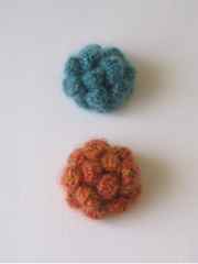 | 概要 | モヘア糸で編むコサージュです。 夏にやっていたアンダリヤのコサージュと同じ編みかたで、 登場するのは、くさり編み、長編み、中長編み、こま編み、引き抜き編み。それだけ。 糸は、上の2色の中からお選びいただきますが、 量に限りがあるので、なくなり次第終了します。そしたらほかの糸に替えるかも。 直径約6cm。色は、上からグリーン/オレンジ | ヒッコリーストライプ(デニムの一種)で作るこのコサージュは、 10年以上前から作っているお気に入り。 ボンドを塗り、切り込みを入れて、ぐし縫いして縮めて・・・と、縫うところはほんの少しだけ。 花芯には、共布で作ったくるみボタンをつけます。カジュアルに使えて、難易度もいちばん低いかな? 直径約7.5cm。色は、上からネイビー/ブラウン。 | メタリック・レザーで作るコサージュ。 花弁は、型紙をあてて革を裁ち、縁がくるっと丸くなるように形づくります(コテは使いません)。 花芯は、細長く裁った革に細かく切り込みを入れ、くるくる巻いて作ります。 針も糸も使いません。ボンドだけ。(ただし、ちょっと臭いよ) 直径約6.5cm。厚さ0.8mmくらいの扱いやすい羊革で、色は、上からシルバー/ゴールド。 |